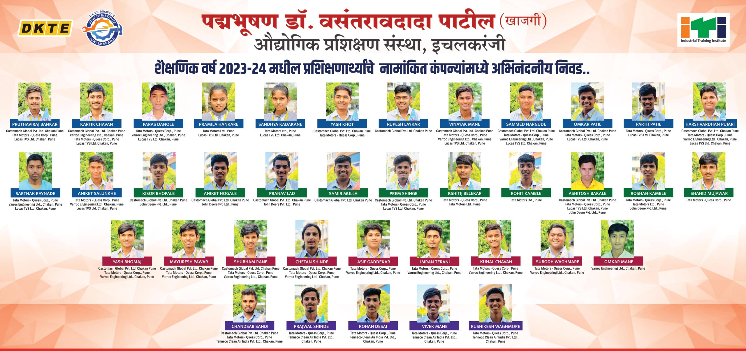 Under the dynamic leadership of Shri. K.B. Awade (Founder Chairman) of DKTE Society, Management of DKTE Society started Padmabhushan Dr. Vasantraodada Patil Pvt. ITI at Sou, Indumati Kallappanna Awade Shaikshanik Sankul, R.S. No. 644, Near Adinath Housing Society, Sangli Road, Ichalkaranji with Four Trades Electrician, Fitter, Draughtsman Mechanical & Welder with 20 intakes each, in the academic Year 2019-2020. (View More-Link to About DKTE)